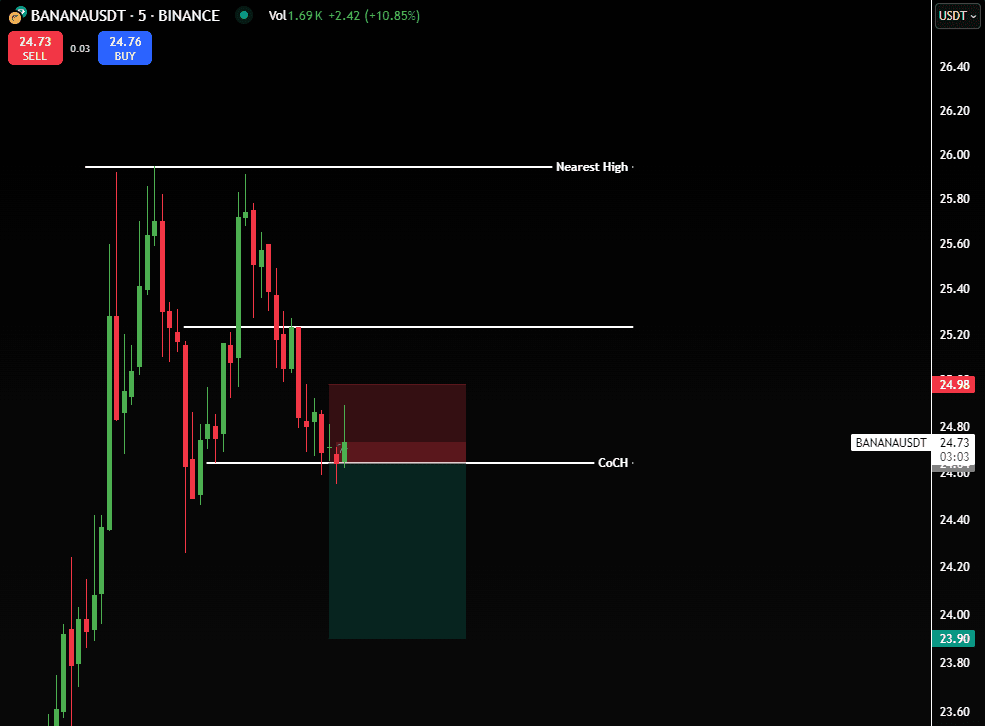 Plongeons dans le graphique de 5 minutes pour Banana Coin. Un Changement de Caractère (ChOCH) est en formation, et voici comment nous prévoyons de le trader :