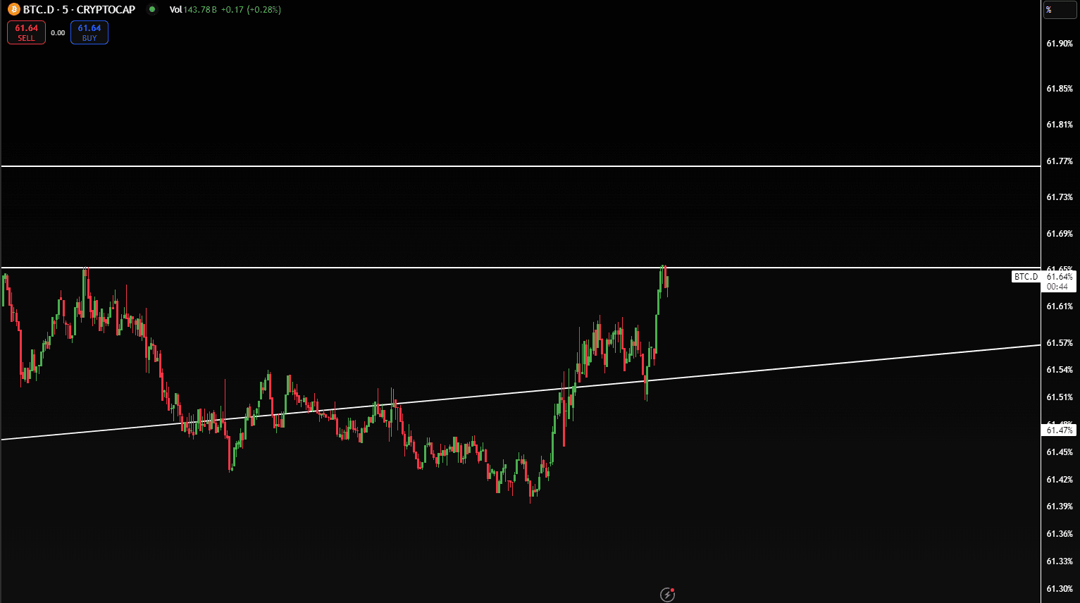 La dominance du Bitcoin teste actuellement son niveau de résistance sur le graphique de 5 minutes.