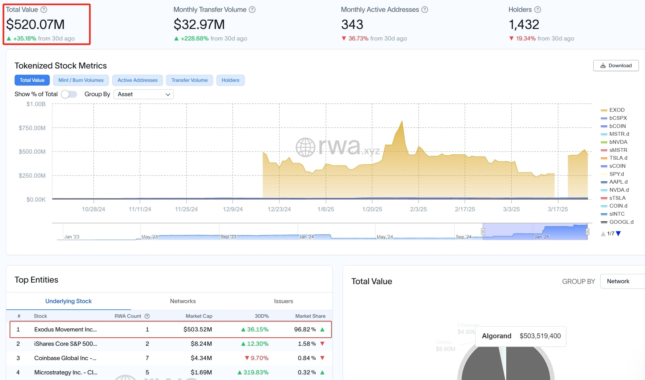 1. La croissance de la piste provient principalement de la chaîne Algorand, avec un développeur de portefeuille @exodus, émettant via la plateforme Securitize @Securitize.