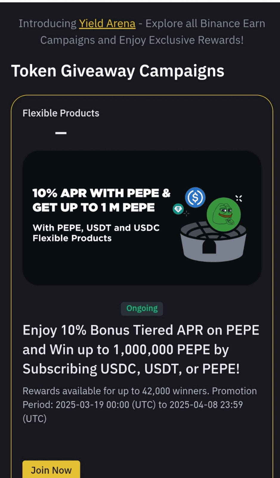Commencez avec des campagnes comme $PEPE pour voir à quel point il est facile de participer. La nouvelle Arena de Rendement de Binance Earn regorge d'opportunités pour que chacun puisse faire croître sa crypto avec aisance.