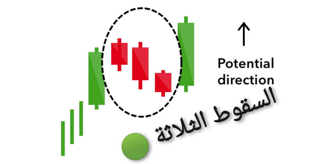 Et inversement pour le motif haussier appelé "motif des trois bougies de descente". Il se compose de trois bougies rouges courtes situées dans la plage de deux bougies vertes longues. Le motif montre aux traders que malgré certaines pressions de vente, les acheteurs conservent le contrôle du marché.