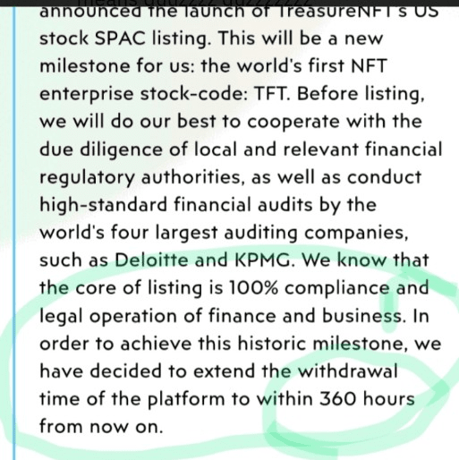 "Personne de l'équipe NFT n'a partagé de publication concernant la désactivation des retraits pendant 360 heures. Cela signifie-t-il que l'application NFT est sur le point de s'enfuir avec l'argent des utilisateurs ? Qu'en pensez-vous ? Partagez votre avis dans les commentaires !"