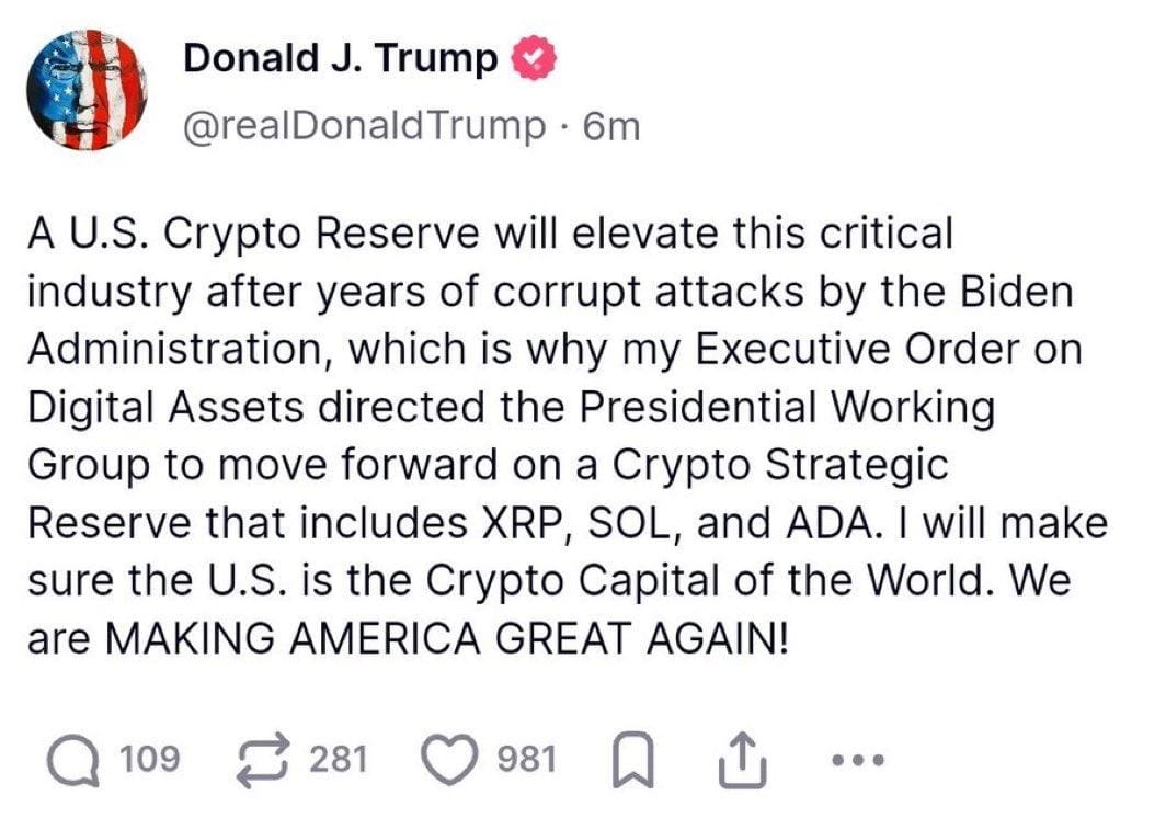 —Trump pousse pour une Réserve Stratégique Crypto 💼 qui inclut XRP, SOL et ADA 🤯 — oui, les mêmes pièces que la plupart des gens ont ignorées récemment.