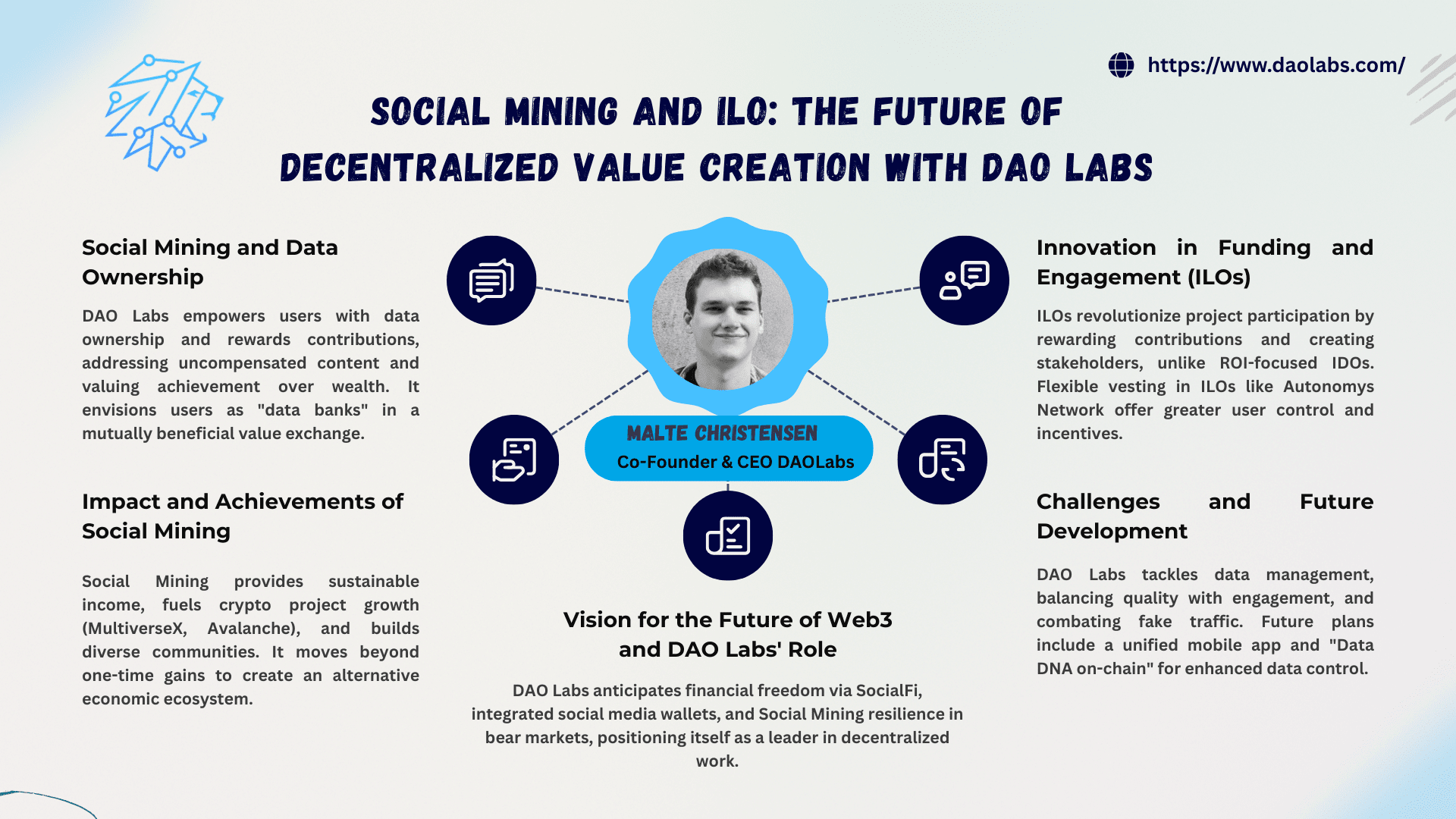 Les réflexions perspicaces du co-fondateur et PDG de @DAO Labs , Malte Christensen, publiées sur le blog DAOLabs, célèbrent le parcours transformateur de la plateforme, mettant en lumière ses contributions innovantes à #Web3 , #SocialMining , et aux Offres de Travail Initiales (ILOs). #DAOLabs a redéfini le paysage numérique en permettant aux utilisateurs de prendre le contrôle de leurs données et en récompensant les contributions plutôt que le pouvoir financier. Cette approche aborde des questions critiques telles que la propriété des données et la sous-évaluation du contenu généré par les utilisateurs, créant un écosystème durable et inclusif.