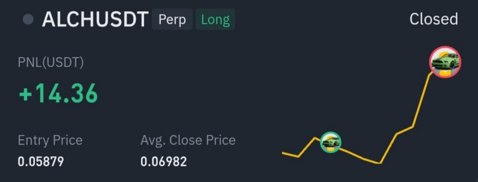 L'image ci-dessus est un exemple d'un trade rentable. Le trader a ouvert une position longue pour $ALCH à 0,05879 et a vendu à 0,06982, réalisant un profit de 14,36 $. Cela aurait été un trade perdant si le trader avait ouvert une position courte au même prix, ce qui lui aurait fait perdre 14,36 $.