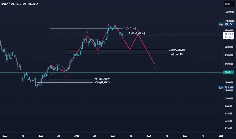 Bitcoin suit actuellement une structure classique d'Elliott Wave, composée de cinq ondes d'impulsion et de trois ondes correctives, étiquetées comme 1, 2, 3, 4, 5, A, B et C.