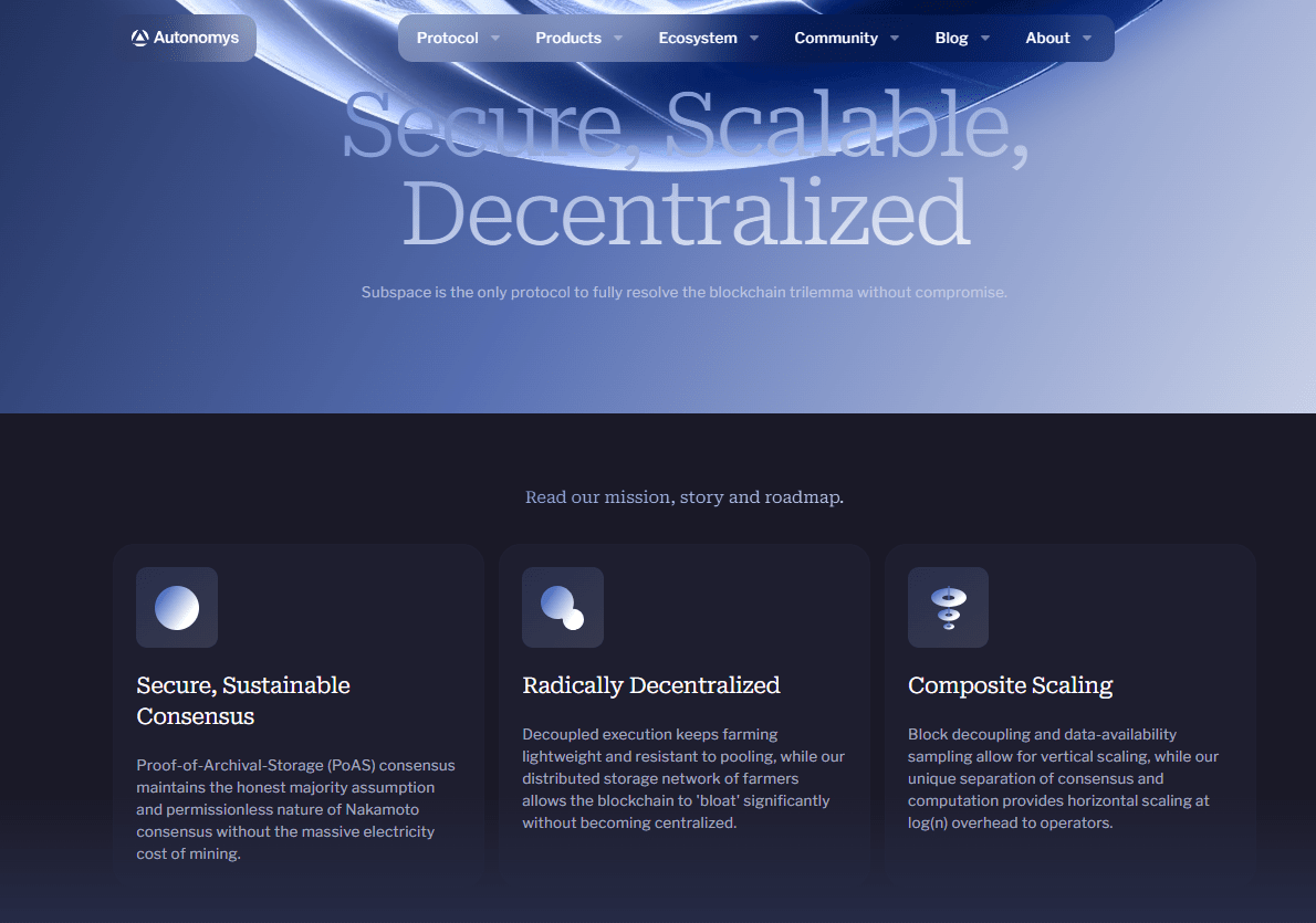 Le réseau Autonomys est construit sur une technologie de pointe conçue pour atteindre simultanément l'évolutivité, la sécurité et la décentralisation. Son mécanisme de consensus novateur Proof-of-Archival-Storage (PoAS) maintient la nature sans permission de la blockchain sans les coûts d'électricité massifs associés au minage traditionnel.