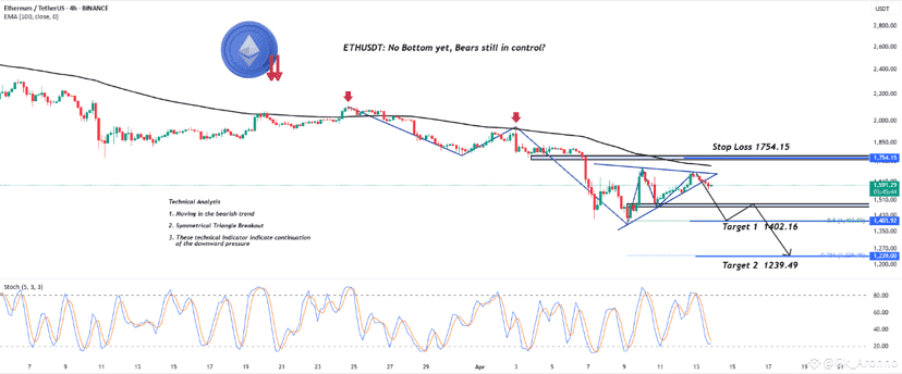 Salut Traders Réalistes, est-ce que ETHUSDT n'est qu'un rebond technique, ou sommes-nous face à une véritable inversion ? Plongeons dans le sujet... Depuis le 26 mars 2025, ETHUSDT a du mal à franchir la ligne EMA100, signalant une tendance baissière. De plus, un motif de triangle symétrique a cassé vers le bas, confirmant encore davantage le momentum baissier. L'indicateur stochastique a croisé et se déplace vers le bas dans la zone neutre, confirmant que la pression de vente pourrait se poursuivre. Ces signaux indiquent qu'Ethereum pourrait chuter vers notre premier objectif à 1 403 $. Après avoir atteint ce niveau, un léger repli est probable alors que les traders prennent des bénéfices, avant que le prix ne continue potentiellement sa descente vers un nouveau bas autour de 1 239 $. Ces objectifs ont été identifiés en utilisant une combinaison de ratios de Fibonacci et de niveaux de support/résistance classiques, comme montré dans le graphique. Cette perspective reste valide tant que le prix évolue en dessous du niveau de stop-loss à 1 754. Soutenez la chaîne en interagissant avec le contenu, en utilisant le bouton fusée et en partageant vos opinions dans les commentaires ci-dessous. Avertissement : "Veuillez noter que cette analyse est uniquement à des fins éducatives et ne doit pas être considérée comme une recommandation de prendre une position longue ou courte sur Ethereum.