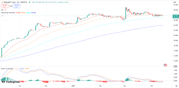 L'analyse du graphique 1D de WBTUSD révèle le pic de WhiteBIT Coin à 31,14 $ début mars 2025, suivi d'une correction à 27,18 $ d'ici le 2 avril, alors que les marchés mondiaux ont chuté en réaction aux « tarifs de Trump ». Le prix de WBTUSD a franchi et clôturé au-dessus de 25,05 $ début janvier, transformant la résistance en niveaux de support clés.