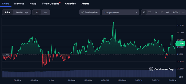 Les taureaux de WBT s'efforcent de franchir la résistance de 28,00 $ alors que le marché crypto plus large se remet lentement de la récente baisse. Le prix monte, se négociant à 27,82 $ pendant la première session nord-américaine de lundi. Le jeton a maintenu une perspective hawkish tout au long du week-end, alors que les traders se sont arrêtés samedi avant de reprendre leurs opérations normales lors de la session asiatique tardive dimanche. Cela est également soutenu par le sentiment haussier résultant de la suspension des tarifs de 90 jours aux États-Unis.