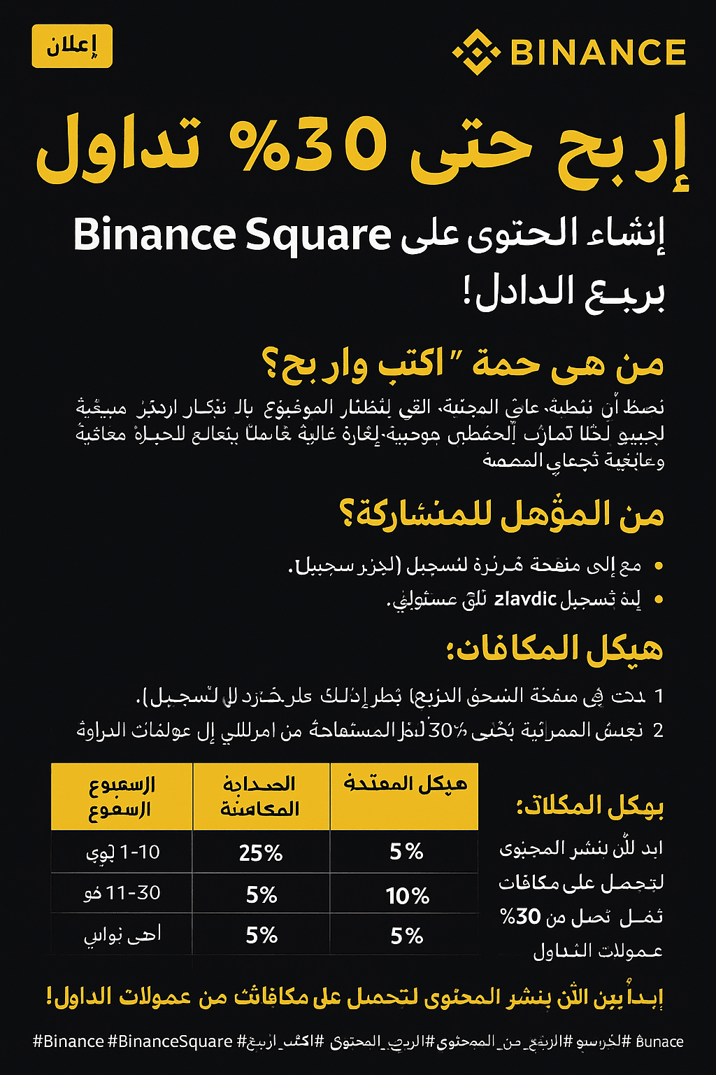 حملة "اكتب واربح" وتحسين هيكل المكافآت لجميع صانعي المحتوى على Binance Square. تتيح هذه المبادرة للمبدعين فرصة تحقيق دخل يصل إلى 30% من عمولات تداولات المتابعين على التداول الفوري، والهامش، والعقود الآجلة!