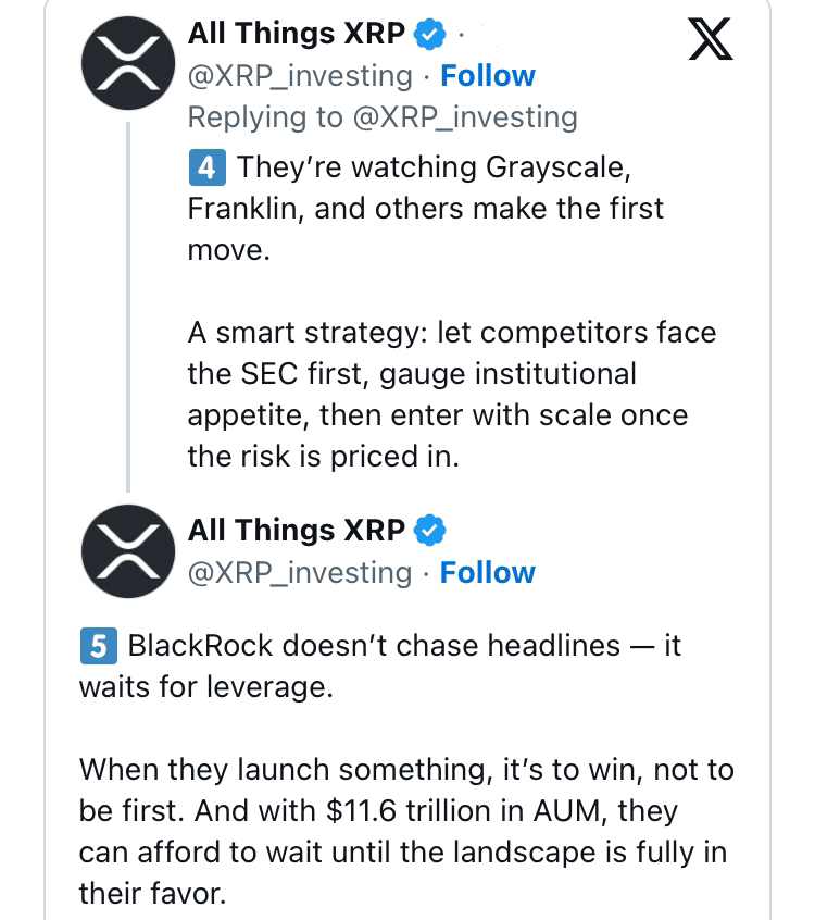 Une récente analyse de l'analyste derrière le compte "XRP Investing" sur X révèle un aperçu des raisons pour lesquelles BlackRock continue de rester sur la touche, même si des concurrents comme Grayscale, Franklin Templeton et Bitwise avancent avec des dépôts.