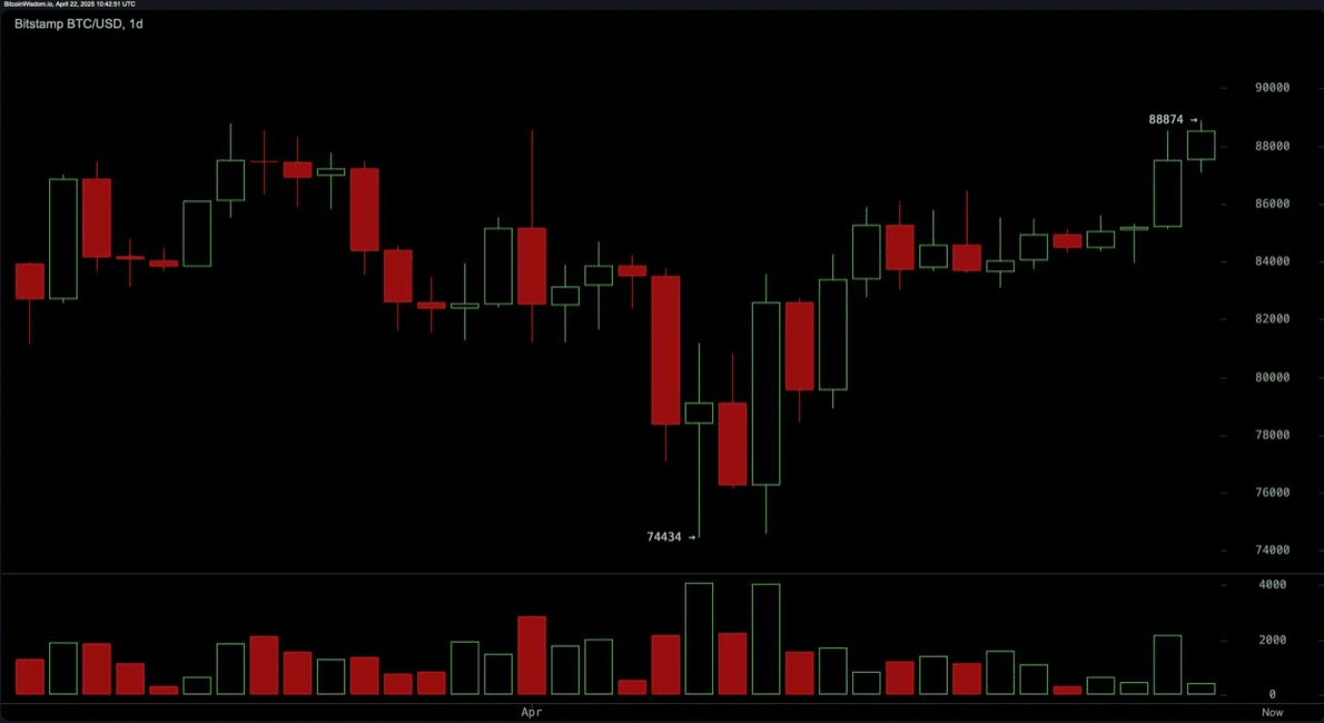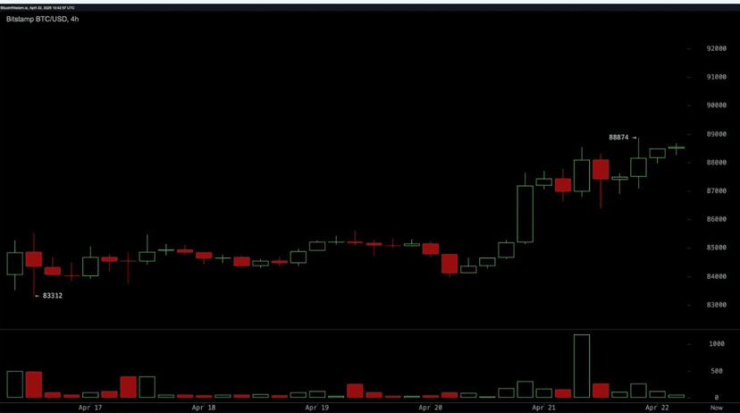 $BTC a été échangé à 88,447 $ le 22 avril 2025, sécurisant une capitalisation boursière de 1,75 trillion de dollars. Au cours des 24 dernières heures, il a évolué dans une fourchette étroite de 86,664.84 $ à 88,874 $ sur un volume de trading de 36,36 milliards de dollars, reflétant une consolidation dans une tendance haussière prévalente.