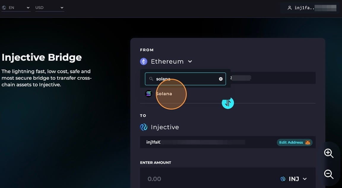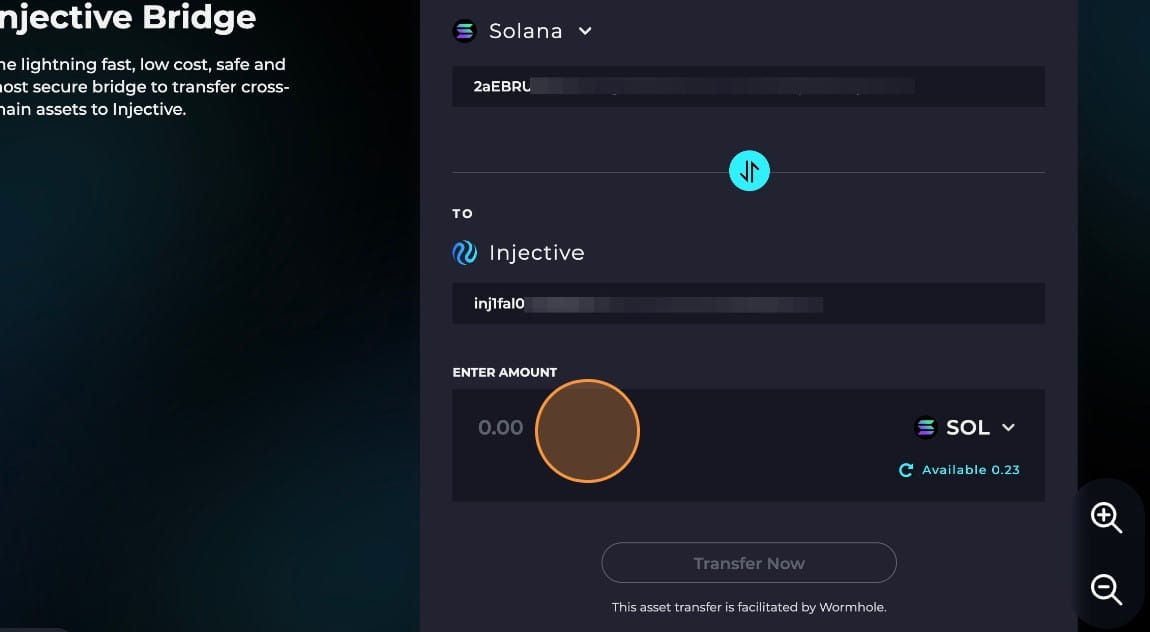 Entrez la quantité de SOL que vous souhaitez faire passer de Solana à Injective