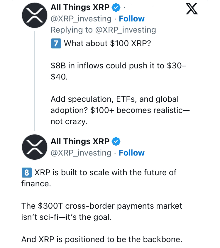 « All Things XRP » a également souligné que l'utilité du jeton va bien au-delà de la spéculation. Il a souligné que XRP est conçu pour des paiements transfrontaliers et intégré dans des systèmes bancaires mondiaux et des plateformes de paiement.