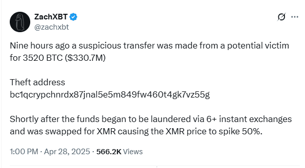 L'enquêteur on-chain ZachXBT a révélé sur X (anciennement Twitter) qu'environ 3 520 BTC, d'une valeur d'environ 330,7 millions de dollars, ont été transférés dimanche dans ce qui est considéré comme un événement de vol significatif.