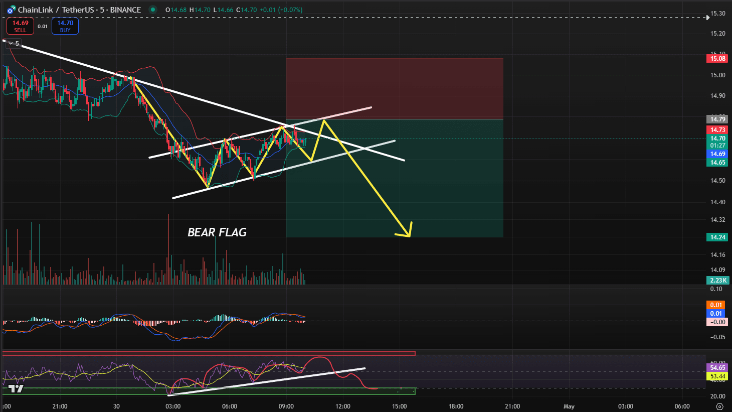 LINK forme actuellement un motif de drapeau baissier sur le graphique de 5 minutes. Je m'attends à un mouvement vers la région de 14,80 $ pour toucher le bloc d'ordre baissier. De plus, le RSI approche de la zone de fourniture, ce qui ajoute de la confluence à un potentiel setup de vente autour de ce niveau.