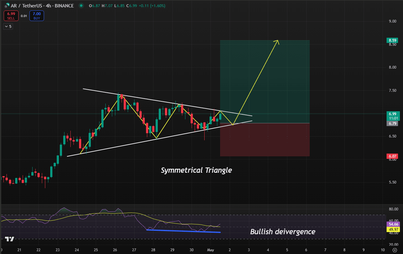 AR forme un triangle symétrique sur le graphique de 4 heures. Si cela casse au-dessus de la ligne de tendance supérieure, nous pourrions voir une continuation haussière. Il y a aussi une divergence haussière qui se forme sur le RSI, ce qui ajoute au potentiel de hausse. Vous pouvez envisager d'entrer à mon niveau d'entrée, ou attendre une confirmation après la rupture.
