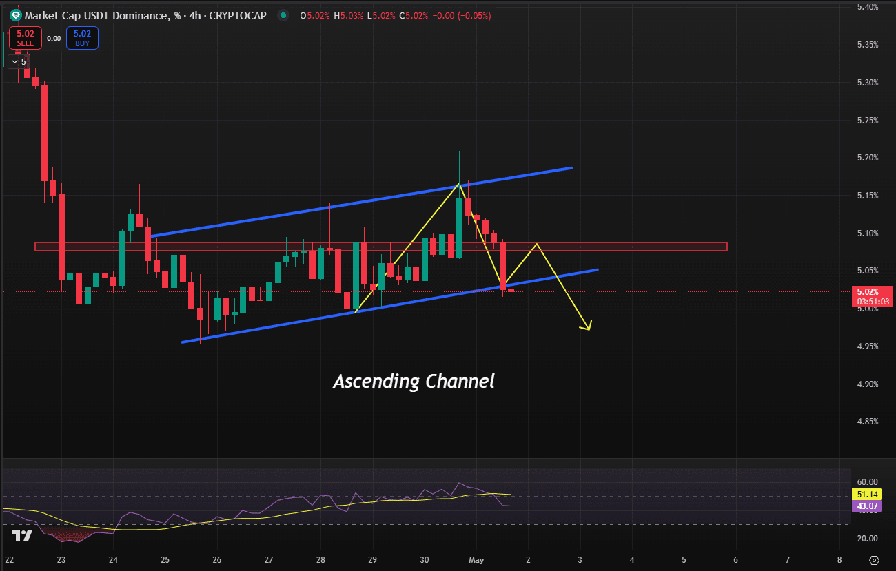 USDT.D forme un canal ascendant sur le graphique de 4 heures et se maintient actuellement au-dessus du support de la ligne de tendance. Il y a un niveau de résistance clé autour de 5.10, où il pourrait faire face à un rejet, signalant potentiellement un changement dans le sentiment du marché.