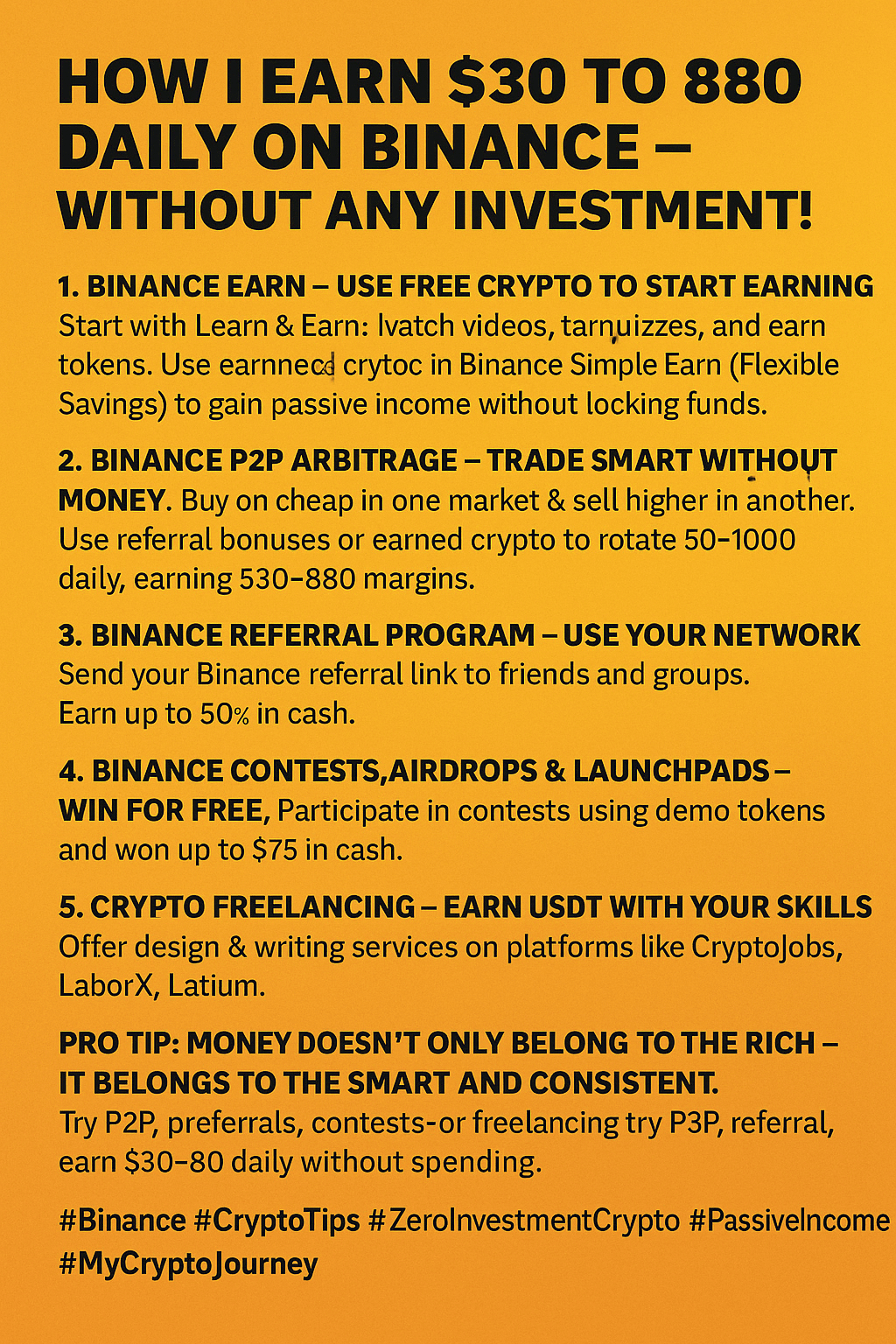 Avez-vous déjà regardé le portefeuille Binance de quelqu'un avec des milliers de USDT et pensé, "Si seulement c'était le mien" ? J'ai pensé la même chose. Au début, je pensais qu'il fallait un gros investissement pour gagner de l'argent avec la crypto—mais la vérité est que vous pouvez gagner entre 30 et 80 $ par jour sans aucun investissement. Voici ma méthode :