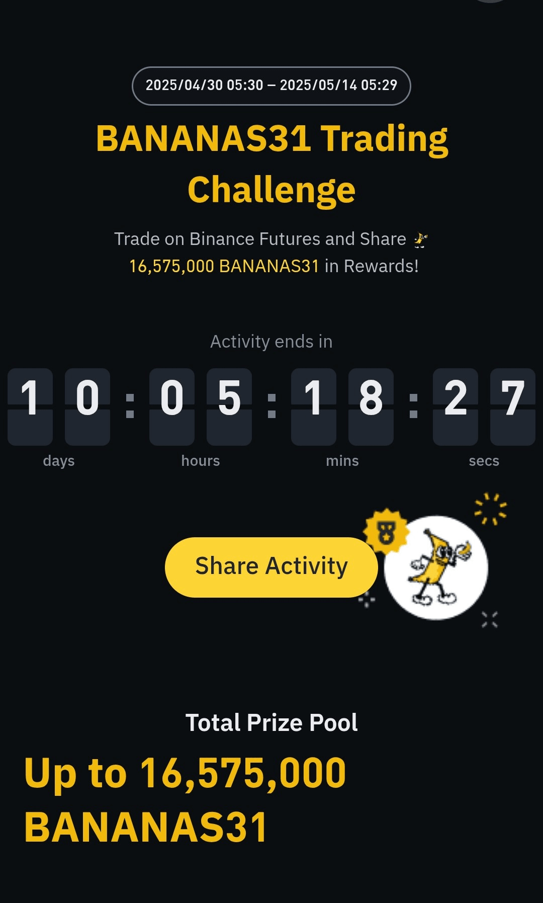 Binance est de retour avec une autre opportunité passionnante pour les traders de futures—présentant le $BANANAS31 Défi de Trading, un événement de deux semaines conçu pour récompenser votre activité de trading avec une part d'un énorme pool de prix de 16,575,000 BANANAS31 !