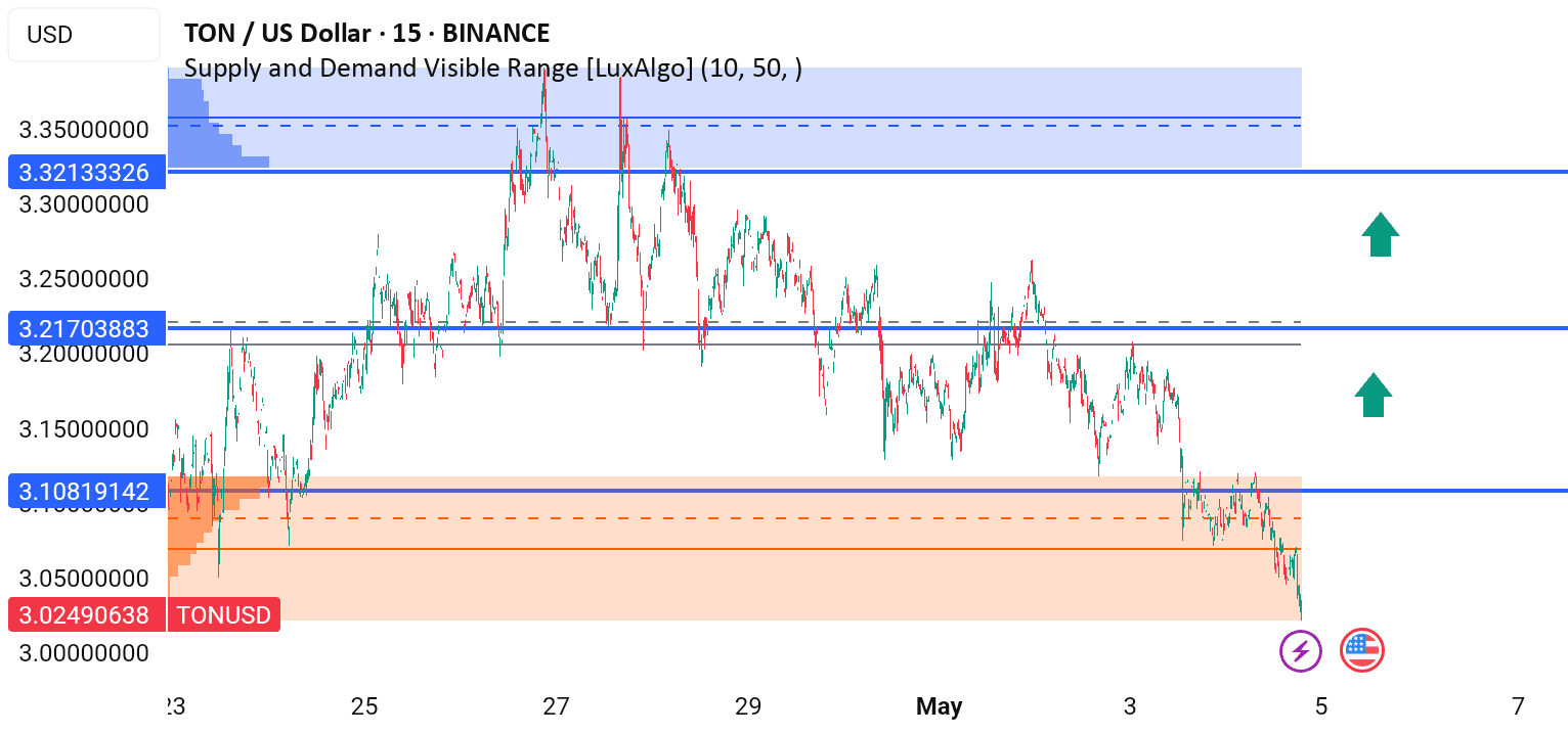 Toncoin vient de tomber dans une zone de demande clé dans la plage de 3,02 $–3,10 $, montrant des signes d'intérêt des acheteurs à ce niveau historiquement réactif.