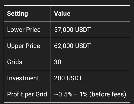 3. Exemples de paramètres du bot Grid (BTC/USDT, marché latéral)