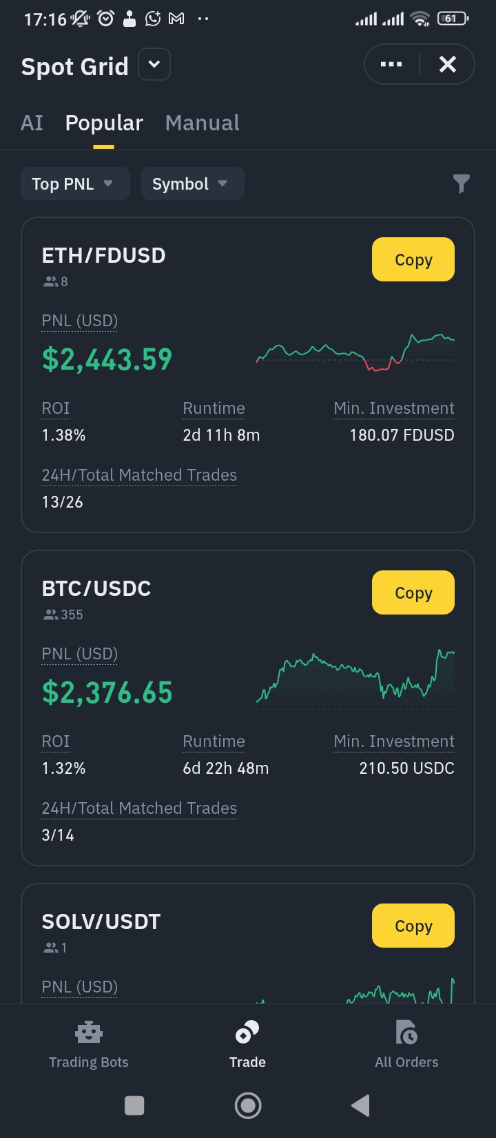 Commencez avec des paires stables comme BTC/USDT, ETH/USDT ou BNB/USDT