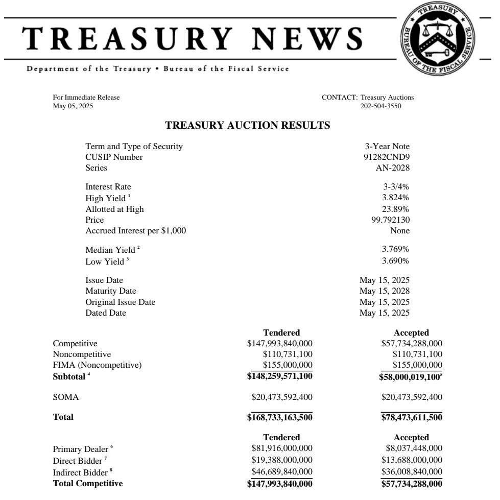 DERNIÈRE MINUTE : La Fed vient d'acheter $BTC 20,47 milliards de dollars d'obligations du Trésor à 3 ans lors de l'enchère du 5 mai. Instantanément, tout le monde a commencé à demander : « Est-ce le retour du QE ? Impriment-ils à nouveau de l'argent ?