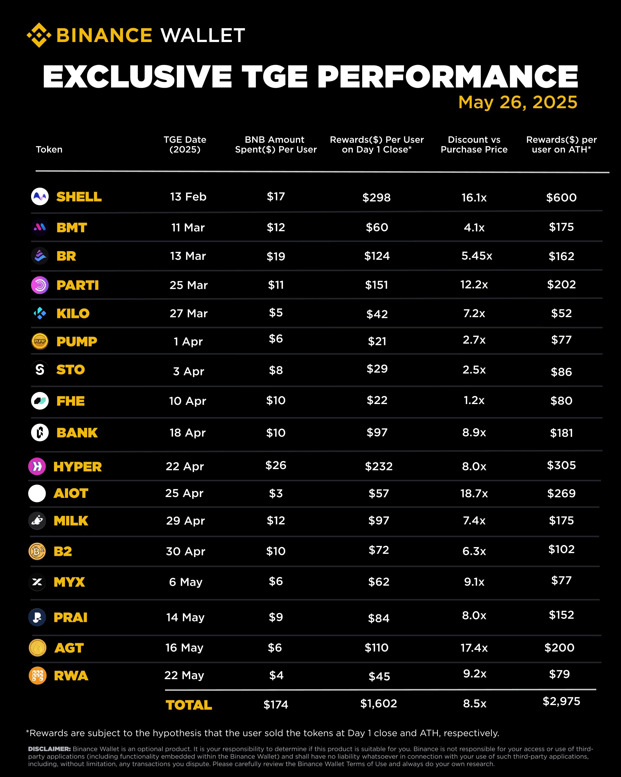 Les TGE sont des événements d'ICO, ce sont des pré-ventes de cryptomonnaies sur Binance et être éligible à un TGE est synonyme de profit. Rien qu'en ce moi, less participants ont réalisé un retour sur investissement moyenne de plus de 8x sur le montant dépensé.