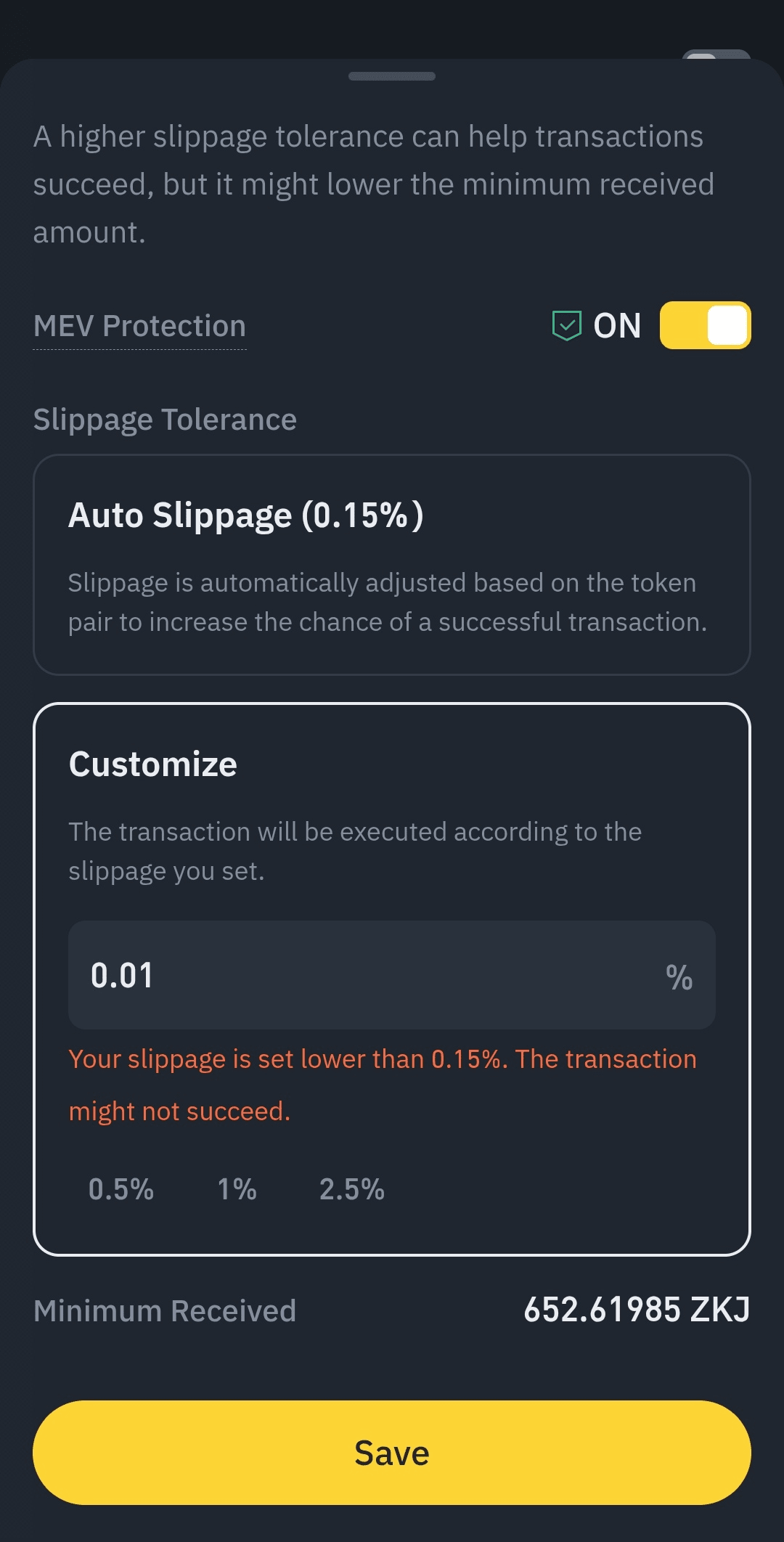 3️⃣ Réglez le slippage à 0,01 % le minimal (au lieu du 1,1 % par défaut). Cela vous donnera un spread plus compétitif, et les transactions passeront toujours rapidement.
