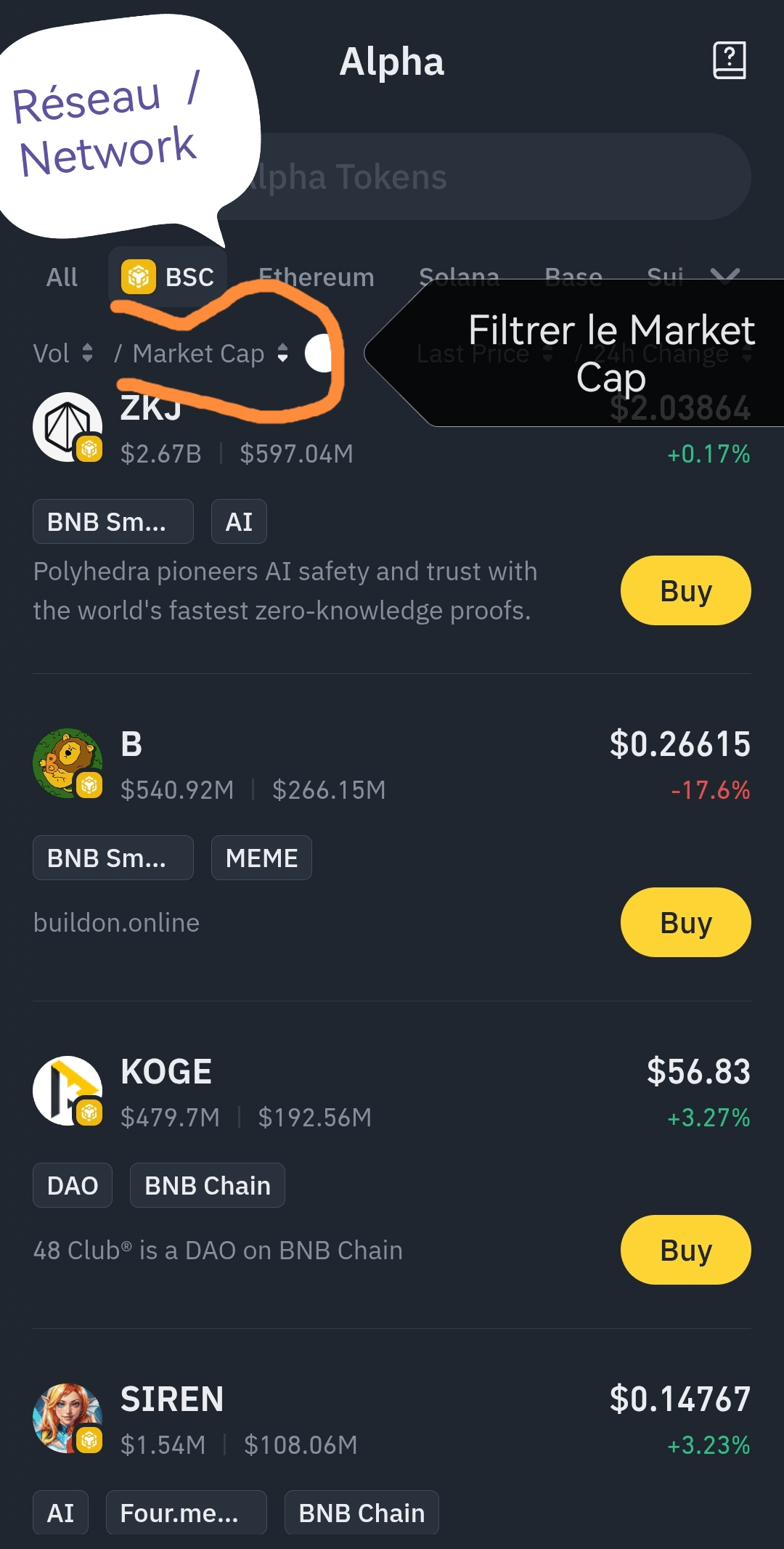 1️⃣ Échangez des tokens du réseau BSC sur Alpha qui ont la plus grande capitalisation boursière et une faible volatilité des prix.