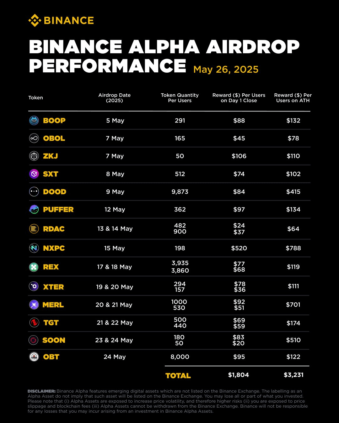 Les points Binance Alpha sont la condition nécessaire pour recevoir les airdrops Binance Alpha et pour participer aux TGE. Les airdrops Binance alpha sont des parts d'un futur token Binance alpha qui sont distribuées gratuitement aux utilisateurs qui ont le minimum de points requis, ces airdrops peuvent aller jusqu'à des centaines de dollars $ par utilisateur. Il est important de noter que Binance Alpha a distribué jusqu'à 3000$ par utilisateur, en airdrop rien qu'au mois de mai, intervalle 1er mai au 26 mai et ça continue encore.