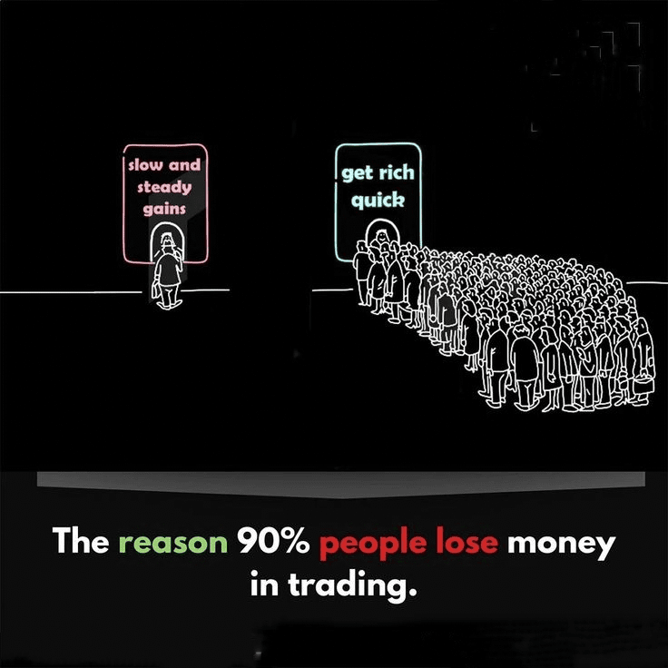 Cette image reflète l'état d'esprit de nombreux nouveaux traders. Ils veulent des profits rapides, de grandes victoires et un succès du jour au lendemain. Les médias sociaux et les histoires éclatantes de traders millionnaires ne font qu'empirer les choses. Le résultat ? Les gens plongent sur le marché sans plan, poursuivant des tendances, prenant de gros risques — et perdent souvent leur argent.