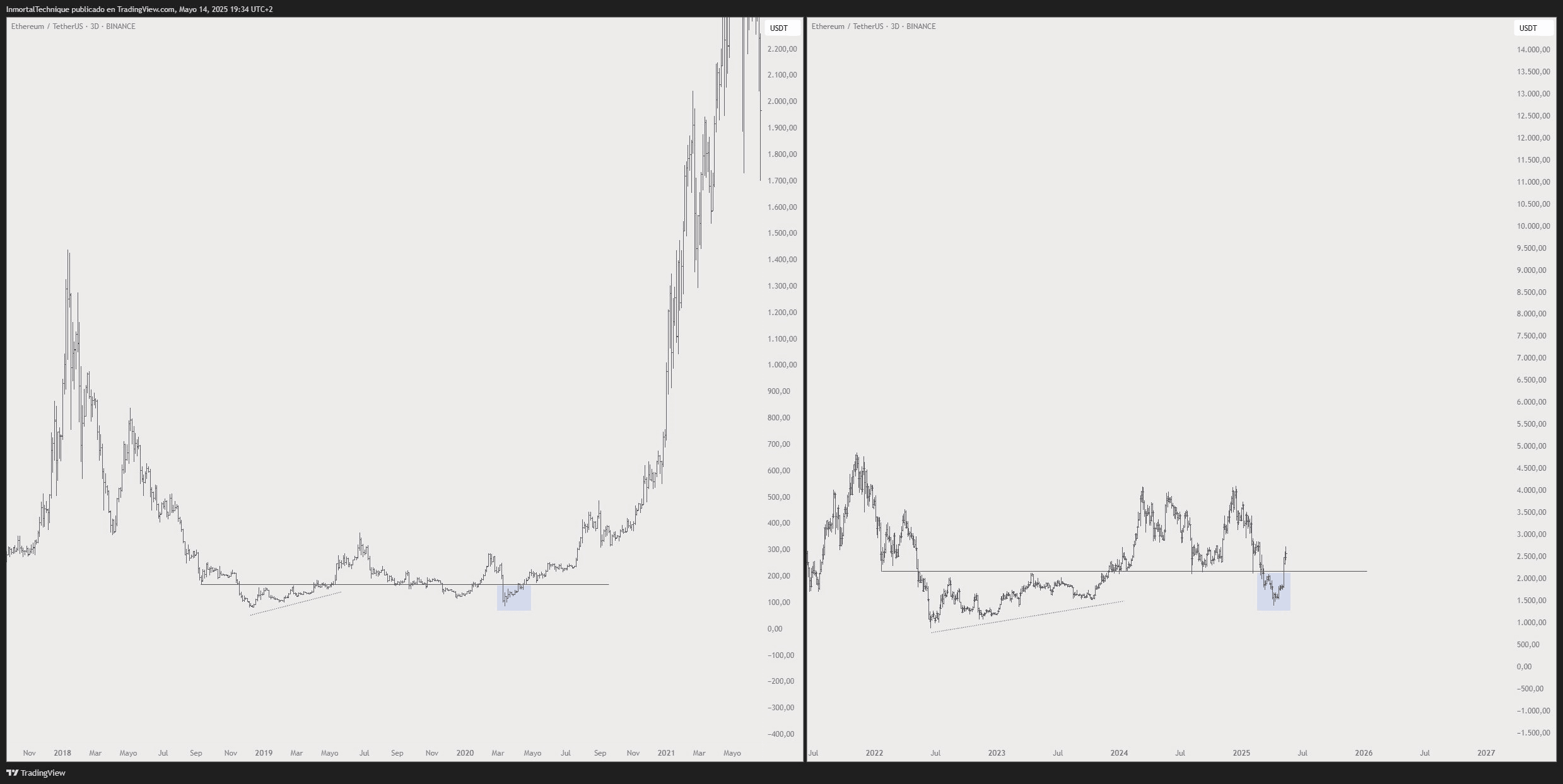 L'analyste pseudonyme Inmortal dit à ses 232 300 abonnés sur la plateforme de médias sociaux X que la structure du marché d'Ethereum sur le graphique de trois jours ressemble beaucoup à son action de prix début 2020.