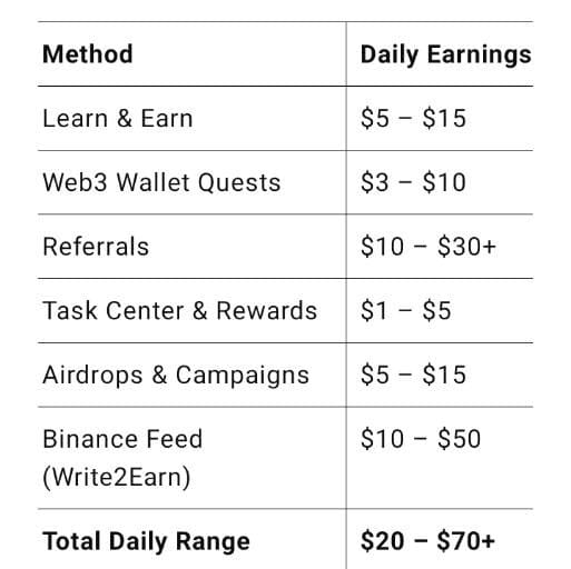 - 3. Programme de parrainage - Invitez et gagnez Toujours Le programme de parrainage Binance est l'un des meilleurs outils de revenu passif. Étapes : Allez sur votre profil sur Binance > Parrainage Partagez votre lien de parrainage Gagnez un pourcentage chaque fois que la personne que vous avez parrainée effectue une transaction ou s'inscrit Astuce pour gagner : Publiez votre lien de parrainage sur Telegram, YouTube, Facebook ou dans des groupes de cryptomonnaie Même avec 5 à 10 parrainages, vous pouvez gagner entre 10 et 30 dollars ou plus par jour ---