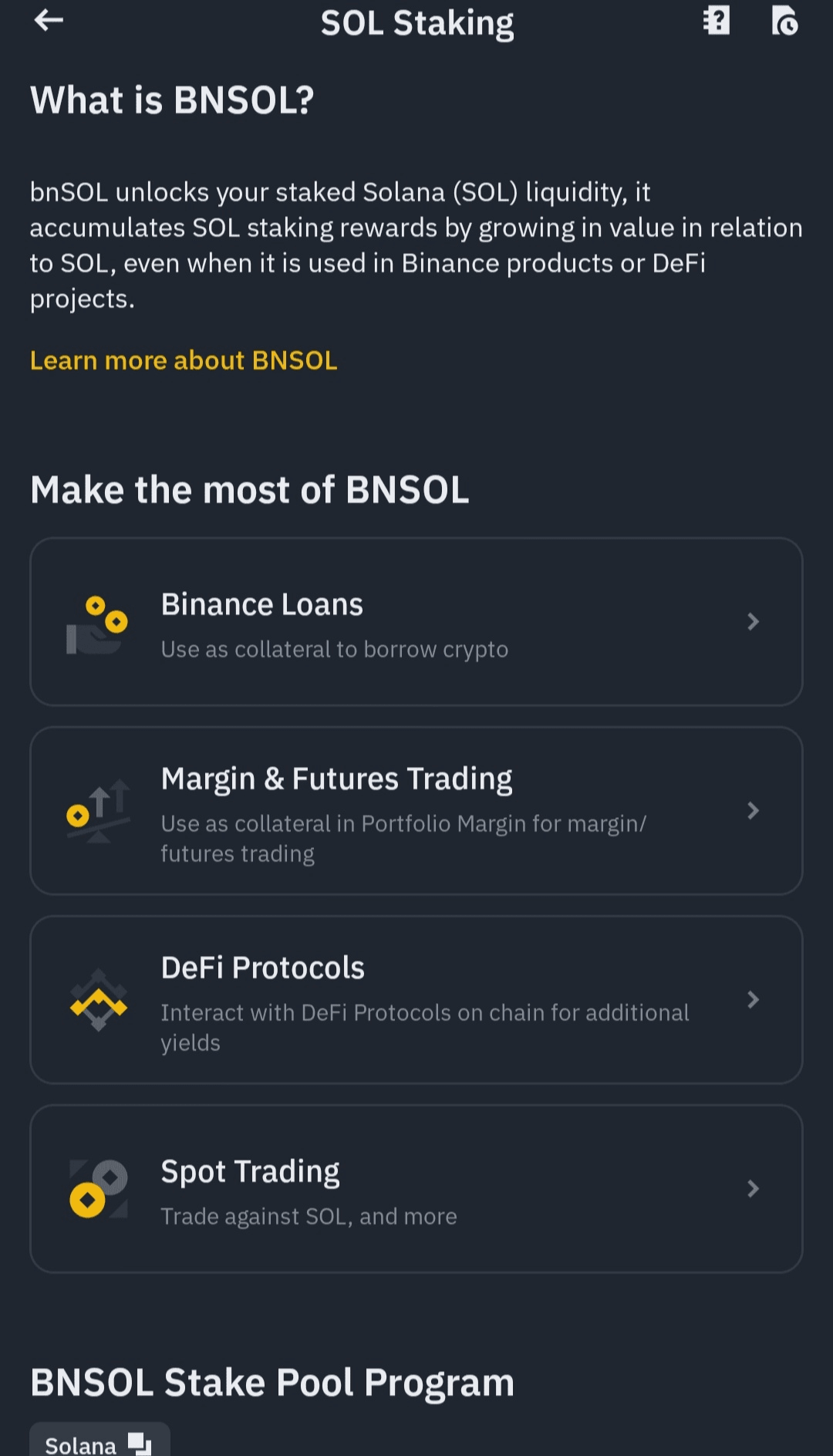 2. Recherchez “BNSOL” dans la section Earn ou Staking.