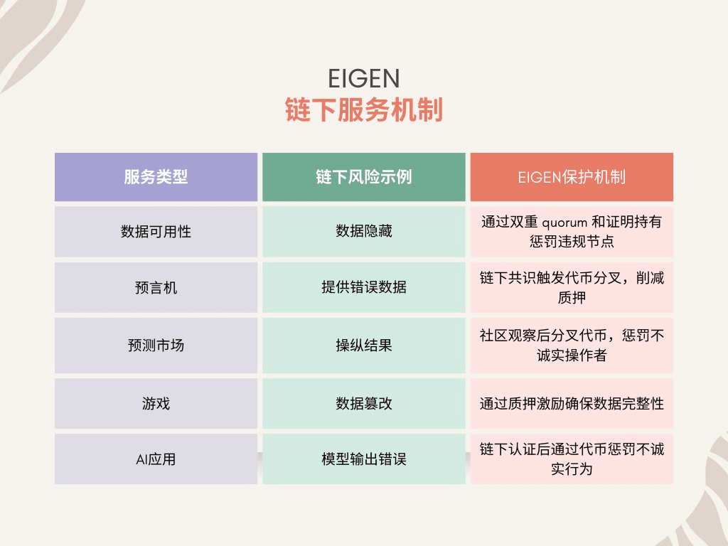Des études montrent que ce mécanisme est particulièrement adapté aux services nécessitant des données ou des calculs hors chaîne, comme les oracle (fournissant des données de prix hors chaîne) ou les applications IA (résultats d'entraînement de modèles hors chaîne). Par exemple, si un oracle fournit des données erronées, la communauté peut déclencher la pénalité des jetons EIGEN par une observation hors chaîne, garantissant la fiabilité des données.