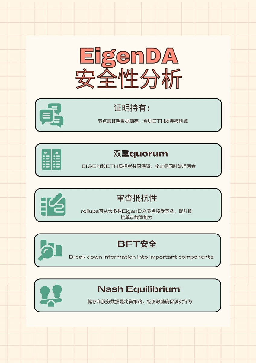 🔹Double quorum : le quorum des stakers EIGEN et des opérateurs, ainsi que le quorum des stakers ETH. Attaquer EigenDA nécessite de détruire simultanément ces deux quorums, dont le coût économique est extrêmement élevé.