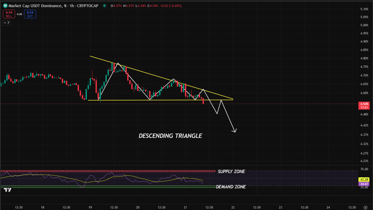 Sur le graphique d'1 heure, USDT.D forme un triangle descendant — un motif typiquement baissier. S'il casse en dessous de la ligne de tendance inférieure, cela pourrait signaler une augmentation de l'appétit pour le risque, déclenchant potentiellement un mouvement haussier sur le marché des cryptomonnaies.