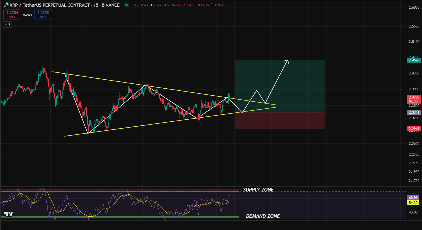 Sur le graphique d'1 heure, XRP forme un motif de triangle symétrique. De plus, le RSI est entré dans la zone d'offre, suggérant une volatilité potentielle à venir. Si XRP franchit la ligne de tendance supérieure avec une forte action de prix et une confirmation de volume, un retest réussi de ce niveau de rupture pourrait représenter une solide opportunité à long terme.