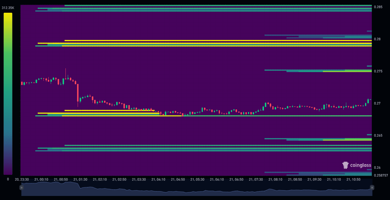 Sur le graphique de 12 heures, il y a une liquidité significative positionnée au-dessus du prix actuel de TRX. Cela pourrait attirer un mouvement de prix à la hausse alors que le marché cherche à balayer cette zone de liquidité.