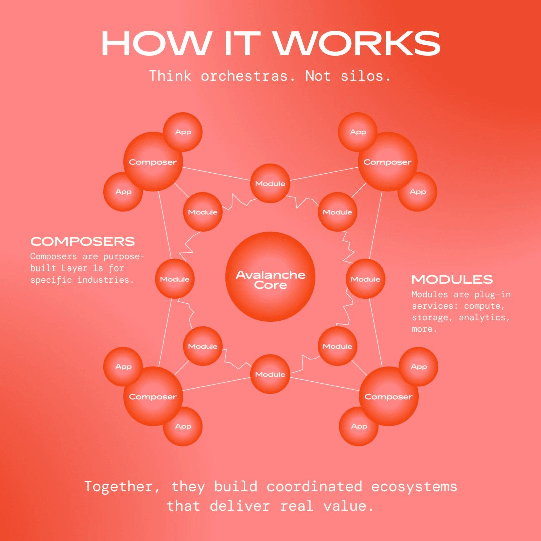 La première couche comprend des « Compositeurs ». Ce sont des blockchains personnalisables qui ciblent des industries spécifiques comme l'IA et la santé.