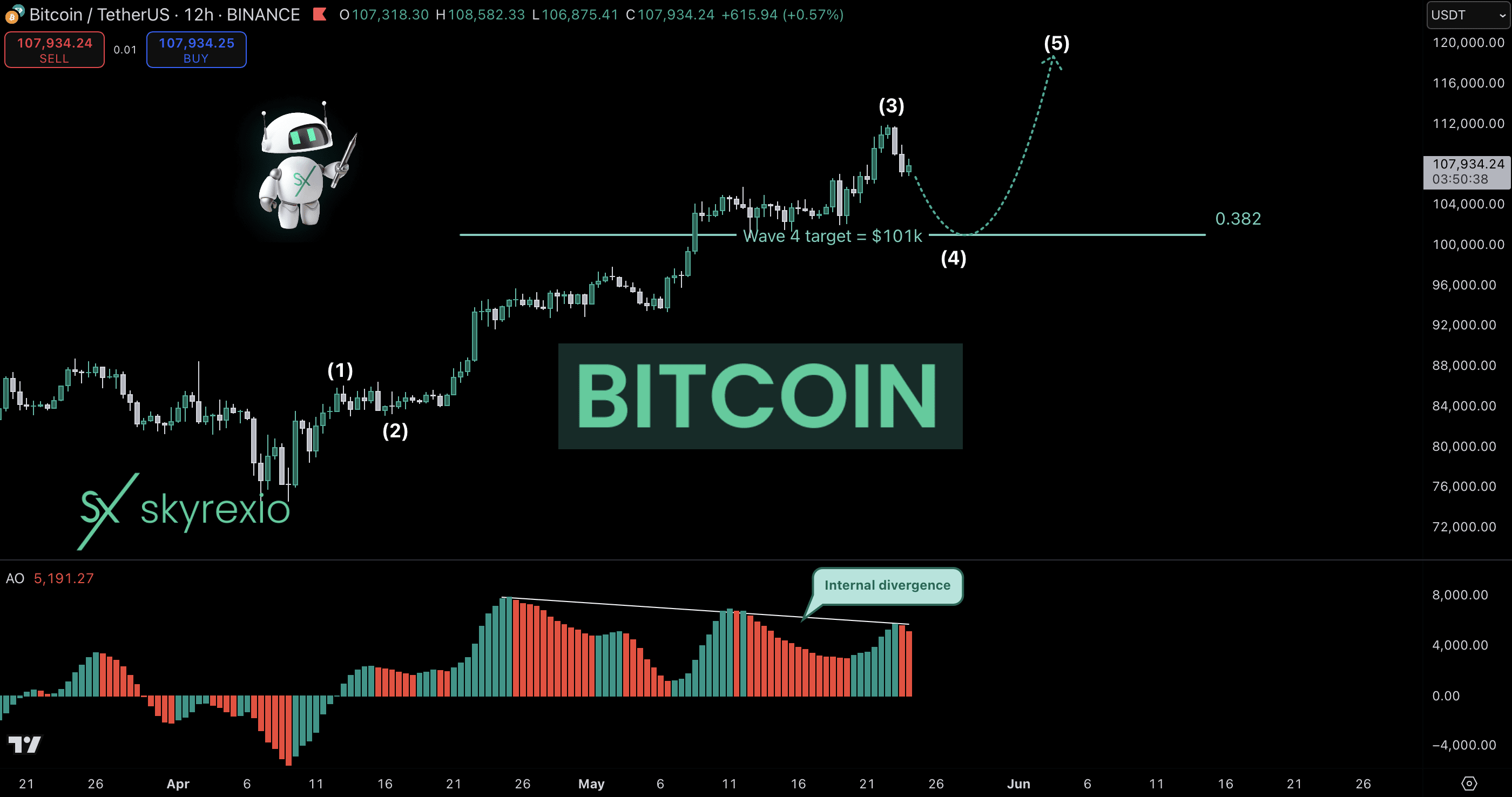 Jetons un œil à une période de 12 heures. La vague 3 est probablement terminée avec une divergence interne double sur l'Awesome Oscillator. Maintenant, il est enfin temps pour la vague 4. 0,38 Fibonacci est l'objectif le plus probable à 101k $. Après cela, la vague 5 est attendue et ce ne sera qu'une vague de degré supérieur 1.