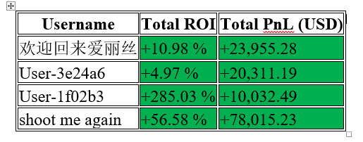 欢迎回来爱丽丝 et User-3e24a6 montrent des profits de pourcentage moyens à un chiffre, suggérant qu'ils ont favorisé un levier plus bas ou des contrôles de risque plus stricts.