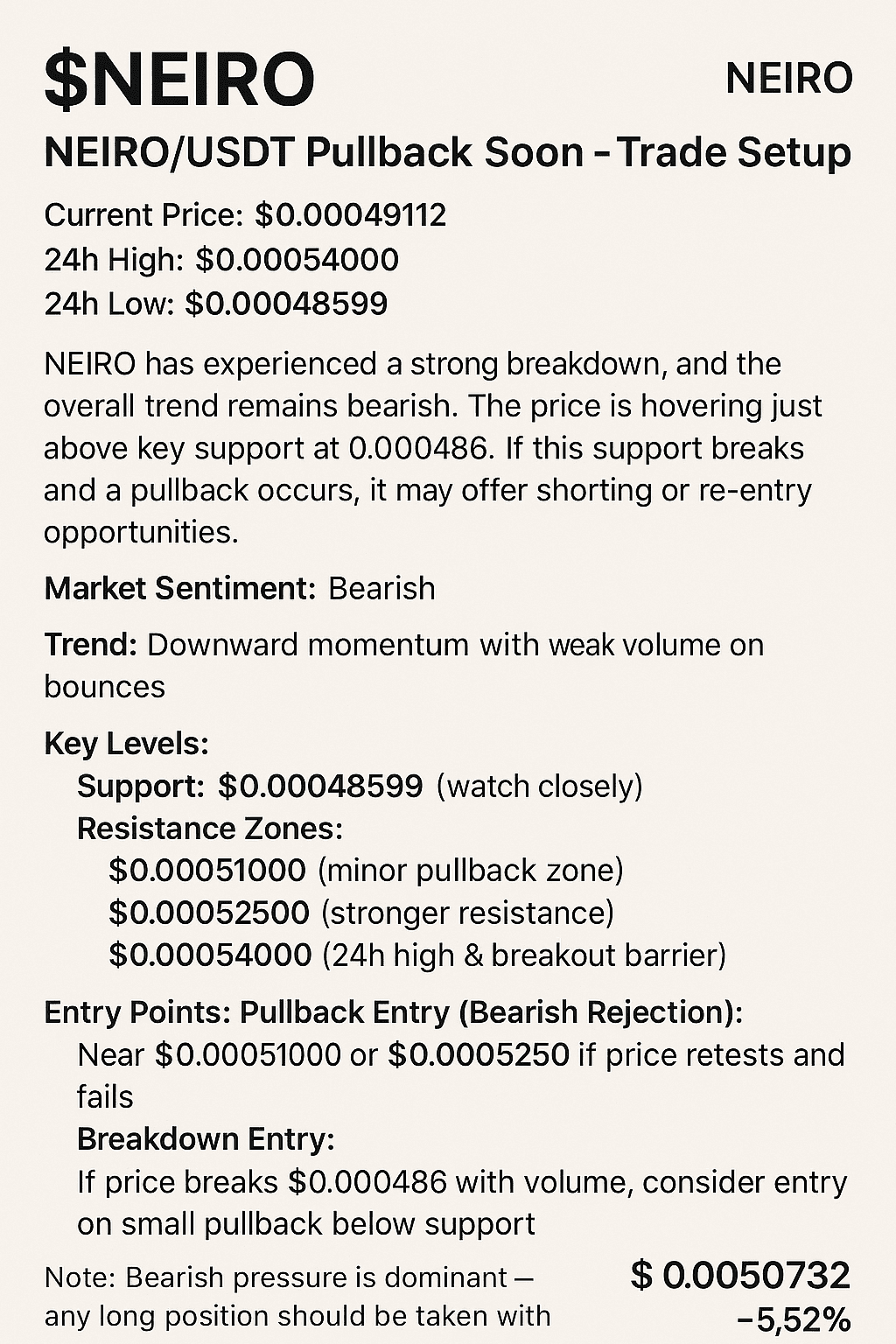 Si NEIRO casse en dessous de $0.000486 avec un volume important, une position courte peut être envisagée sur un petit pullback ou un test de la résistance cassée.