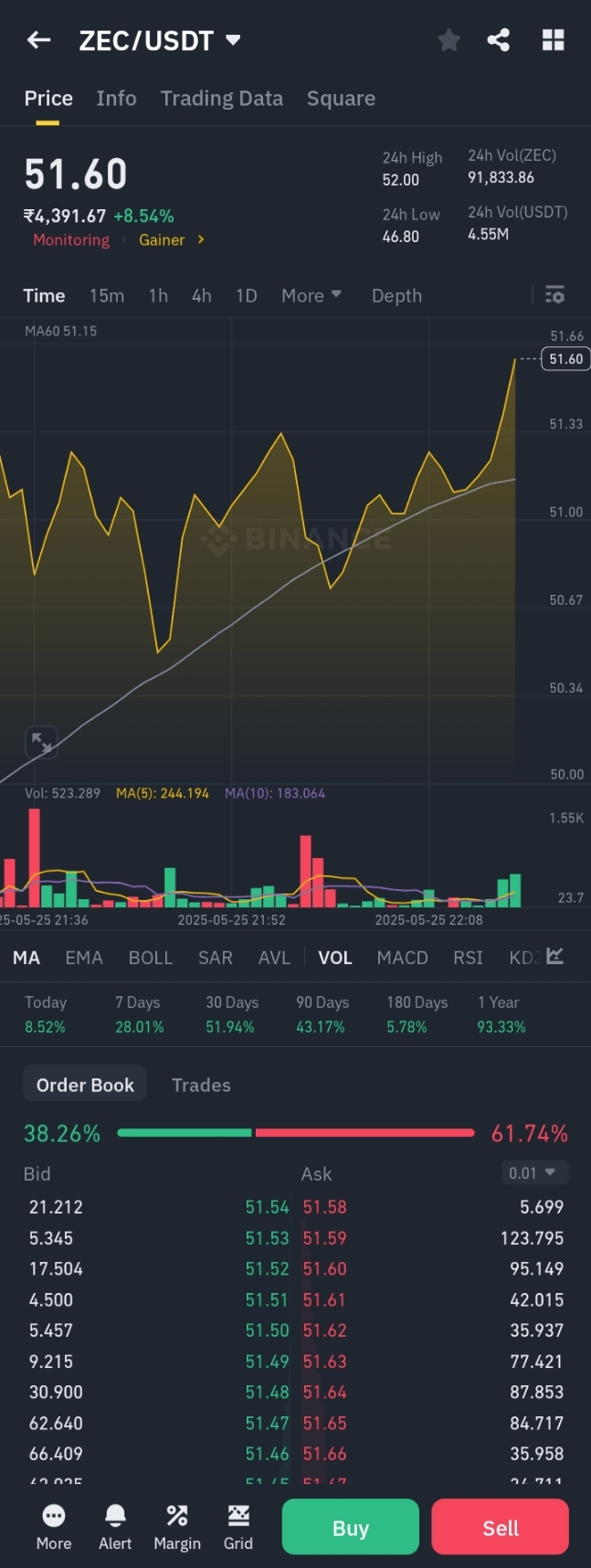 Au 26 mai 2025, Zcash (ZEC) se négocie à 51,45 USDT, avec un plus haut intrajournalier de 51,45 $ et un plus bas de 47,19 $.