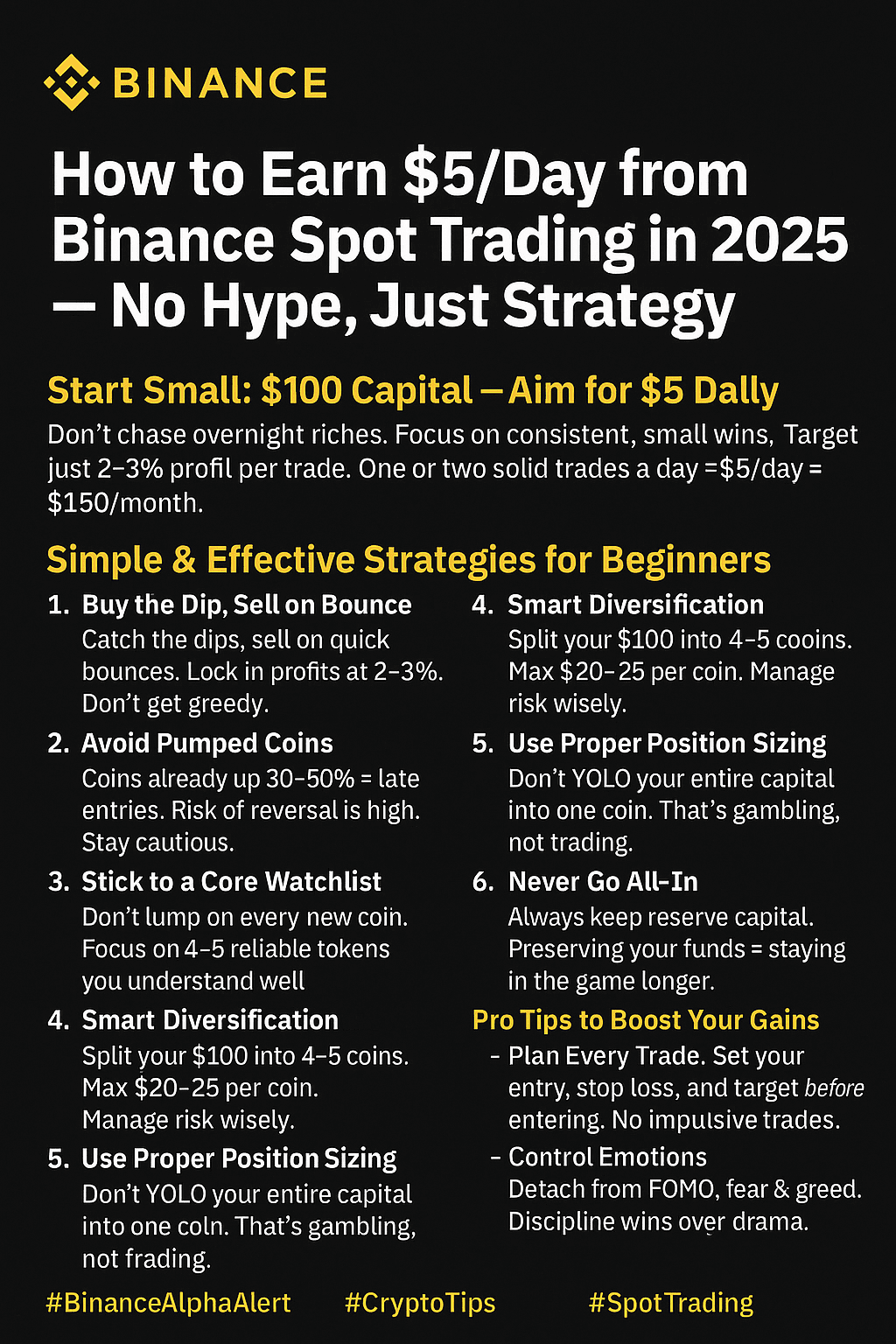 Ne courez pas après des richesses instantanées. Concentrez-vous sur des gains constants et modestes. Visez juste 2 à 3 % de profit par trade. Une ou deux bonnes transactions par jour = 5 $/jour = 150 $/mois.