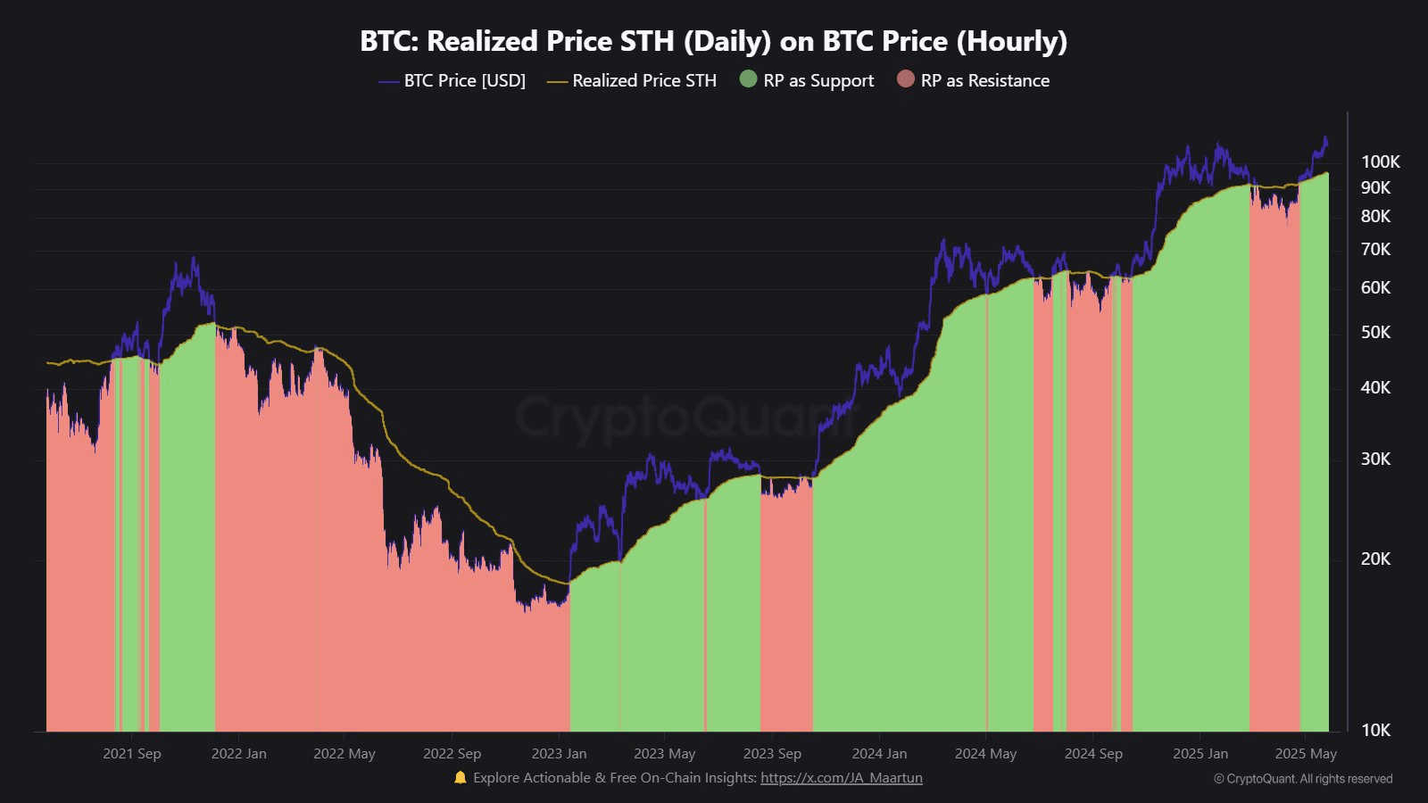 La première métrique est le « Prix Réalisé », un indicateur populaire qui fournit une estimation du coût moyen des investisseurs sur le réseau BTC. Historiquement, il a souvent joué le rôle d'un niveau de support/résistance majeur pour la cryptomonnaie.