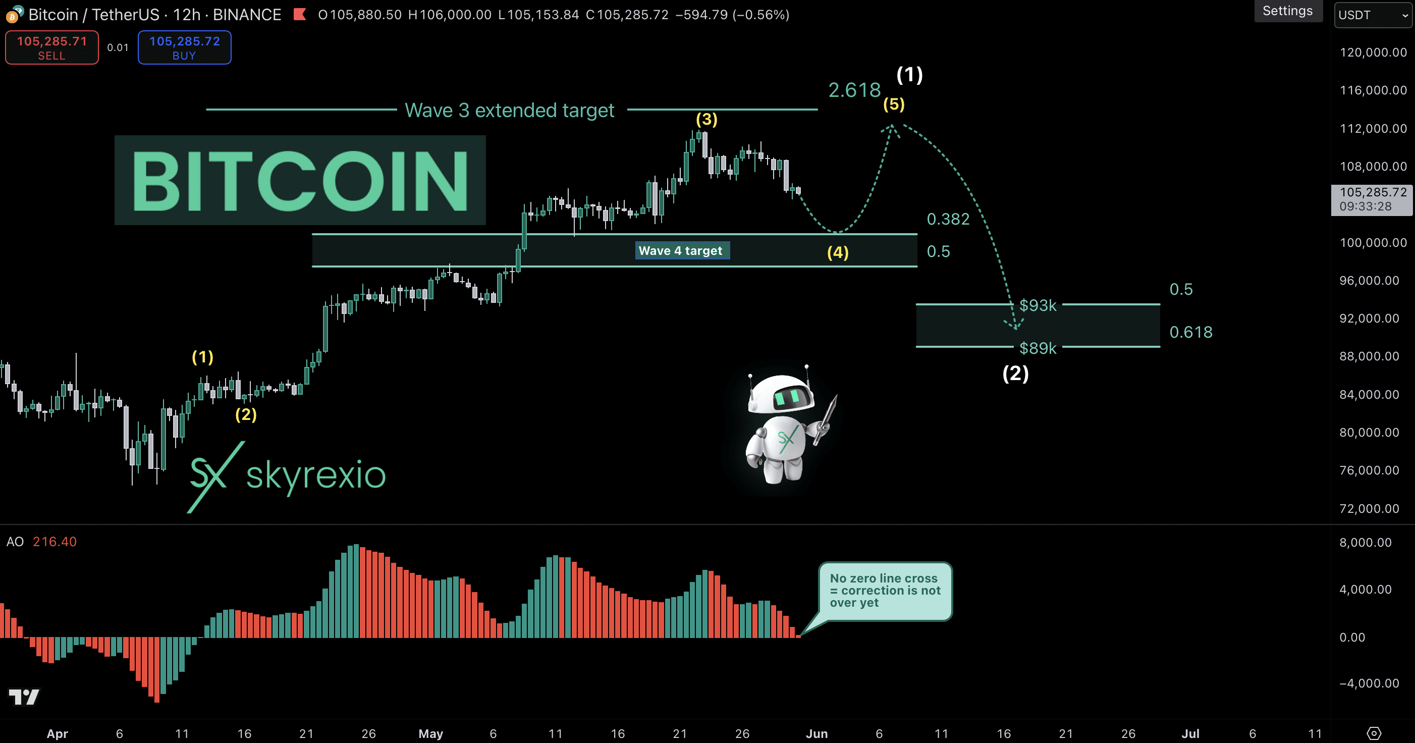 Jetons un coup d'œil au cycle des vagues Elliott jaunes. L'oscillateur Awesome m'a donné l'idée que seule la vague 3 a été terminée au-dessus de 110 000 $. Maintenant, le prix imprime la vague 4. La vague 4 a un objectif entre 0,38 et 0,5 Fibonacci, mais cette fois-ci, ce sera définitivement 0,38 à 101 000 $. Ici se trouvait le bas de la vague 4 de degré inférieur. La vague 5 sera raccourcie car la vague 3 a été étendue, c'est très logique. Après le test de 111 000 $, la grande vague 2 ira à environ 90 000 $. Des temps difficiles à venir pour la crypto, je pense que cette période ne se terminera qu'à la fin de juin.